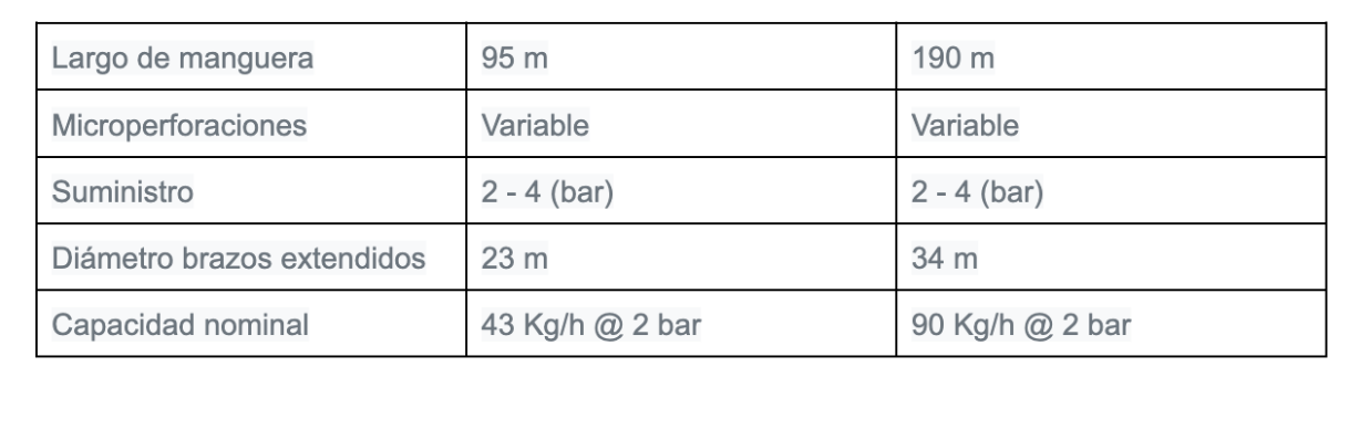 The hose has an asymmetrical perforation pattern, allowing a constant injection flow along its length. The minimum required gas pressure is 40 psig.